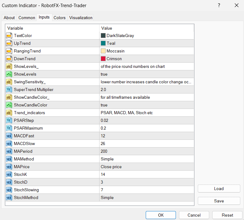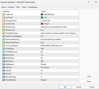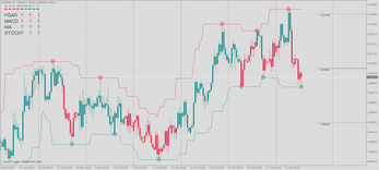 As seen in the chart above, the indicator drew a downtrend, marked the price channel and also drew the trade entries according to this channel. In the upper left of the chart, the indicator shows the candles color for all the timeframes; green is a rising candle while red is a down candle. Depending on the indicator’s settings, there are up/down arrows for the following indicators: PSAR, MACD, Stochastic and moving average. The settings for this indicators are displayed bellow, in the settings.