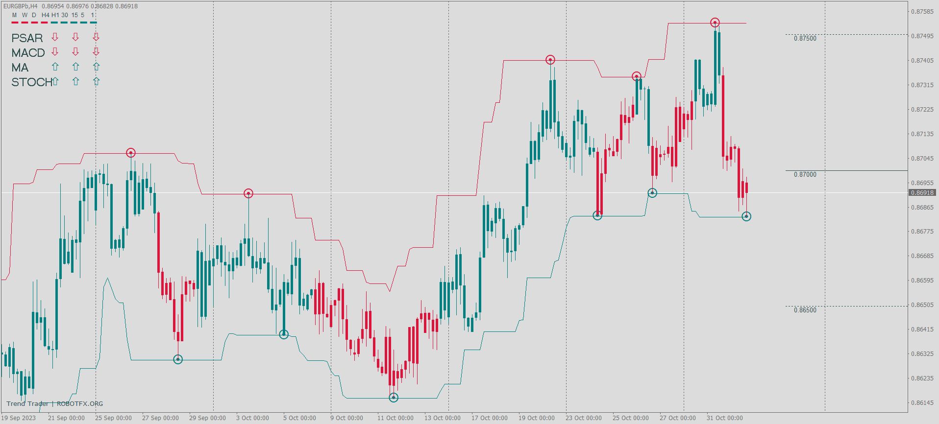 The MetaTrader 4 Trend Trader indicator combines MACD, PSAR, Stochastic, and a moving average to identify and trade trends.